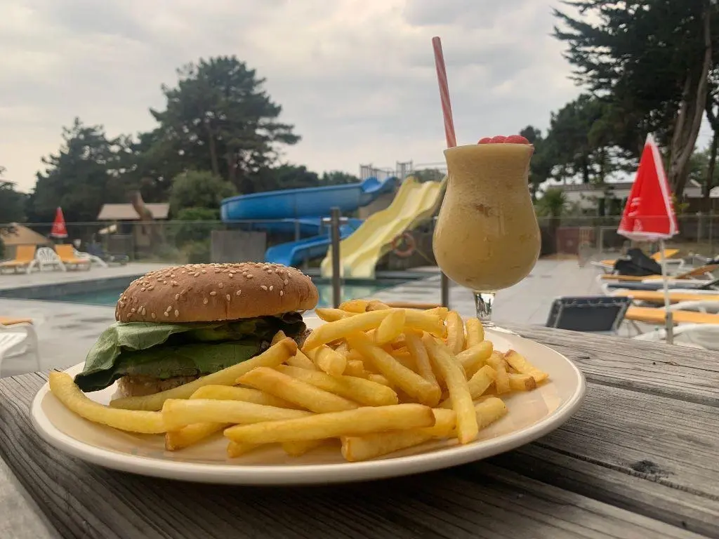 Pendant les mois de juillet et août, le snack/bar du camping propose un dépôt de pain et de viennoiseries, des glaces et des plats à déguster sur place ou à emporter, idéal pour un repas simple et rapide après une journée en bord de mer.