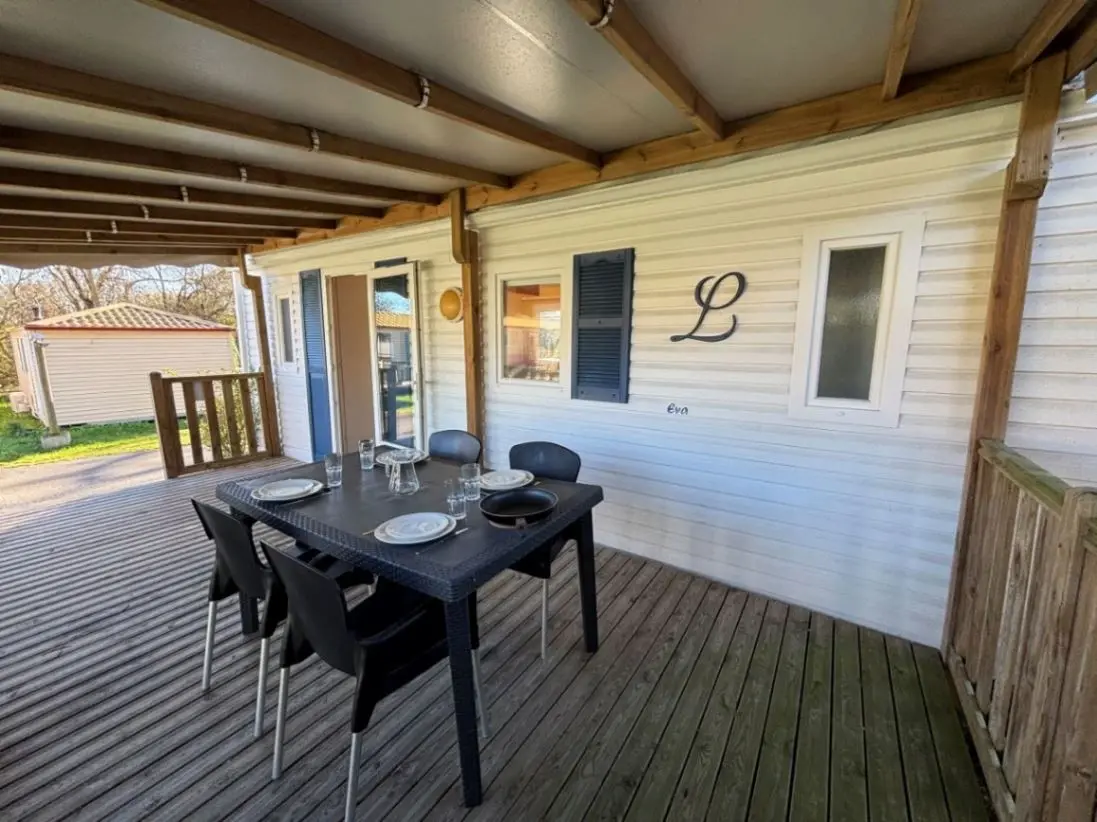Son plus : Profitez également d’une terrasse en bois avec salon de jardin pour vos repas en extérieur ou vos moments de détente.